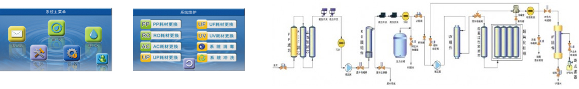 一、性能特點: ■大屏彩色觸控智能顯示屏、智能人性化的操作界面能完全監控設備的工作狀態和實時數據。 ■全自動控制、低壓報警停機保護、水箱滿水自動停止產水 ■全自動微電腦芯片控制系統,多級菜單式操作,控